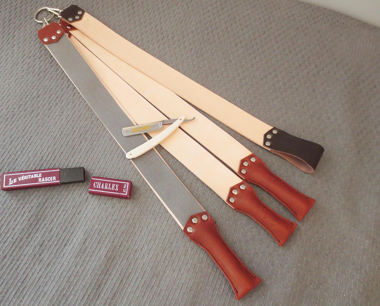 Материал - импортная натуральная некрашенная кожа растительного дубления, обратная сторона - синтетический строп толщиной 3мм. Длина рабочей поверхности от 420 мм и выше, ширина - 50 мм. Такие размеры, по моему скромному мнению, наиболее оптимальны для правки, как прямых, так и улыбчивых бритв. Ручка и остальная обвязка - натуральная кожа. Два, три прохода по ленте, проходов двадцать по коже и ваша бритва направлена . Отправляю почтой России, при покупке ремня с бритвой пересылка за мой счёт. Новичкам подскажу, как править и ухаживать за бритвой, дам ссылку на видео. Цена - 2750 рублей.