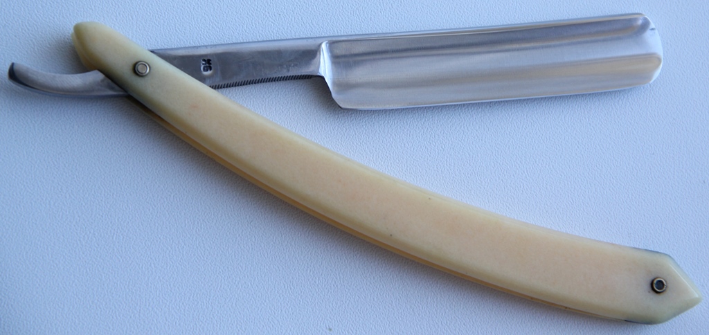 Ширина полотна- 22 мм Толщина обушка- 5.5 мм Полная вогнутость. Углеродистая сталь. Бритва в прекрасном состоянии, без видимых следов пользования.Есть подозрение, что вообще непользованная. Почистил металл в районе осевого пина и снова собрал.Сталь чистая, кромочка идеально ровная по всей длине и еле заметна. Красивая, достаточно увесистая бритва. Заточена и готова к бритью. Цена-7500 р с доставкой.ПРОДАН Не забывайте с бритвой приобрести и ремень для правки! Spoiler Show