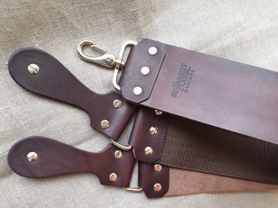 Продаётся от S&T41. Еще один ремень для правки бритв, очень популярная среди американских коллег модель 3" PREMIUM IV (LONG) ENGLISH BRIDLE от закрытого уже бренда Ллина Абрамса Straight Rasor Design, США. Модульная разборная конструкция, размер рабочей зоны для правки 7,6 х 50,7 см. Небольшая коцка на правом ребре, в остальном - без замечаний.