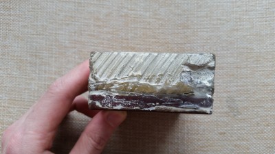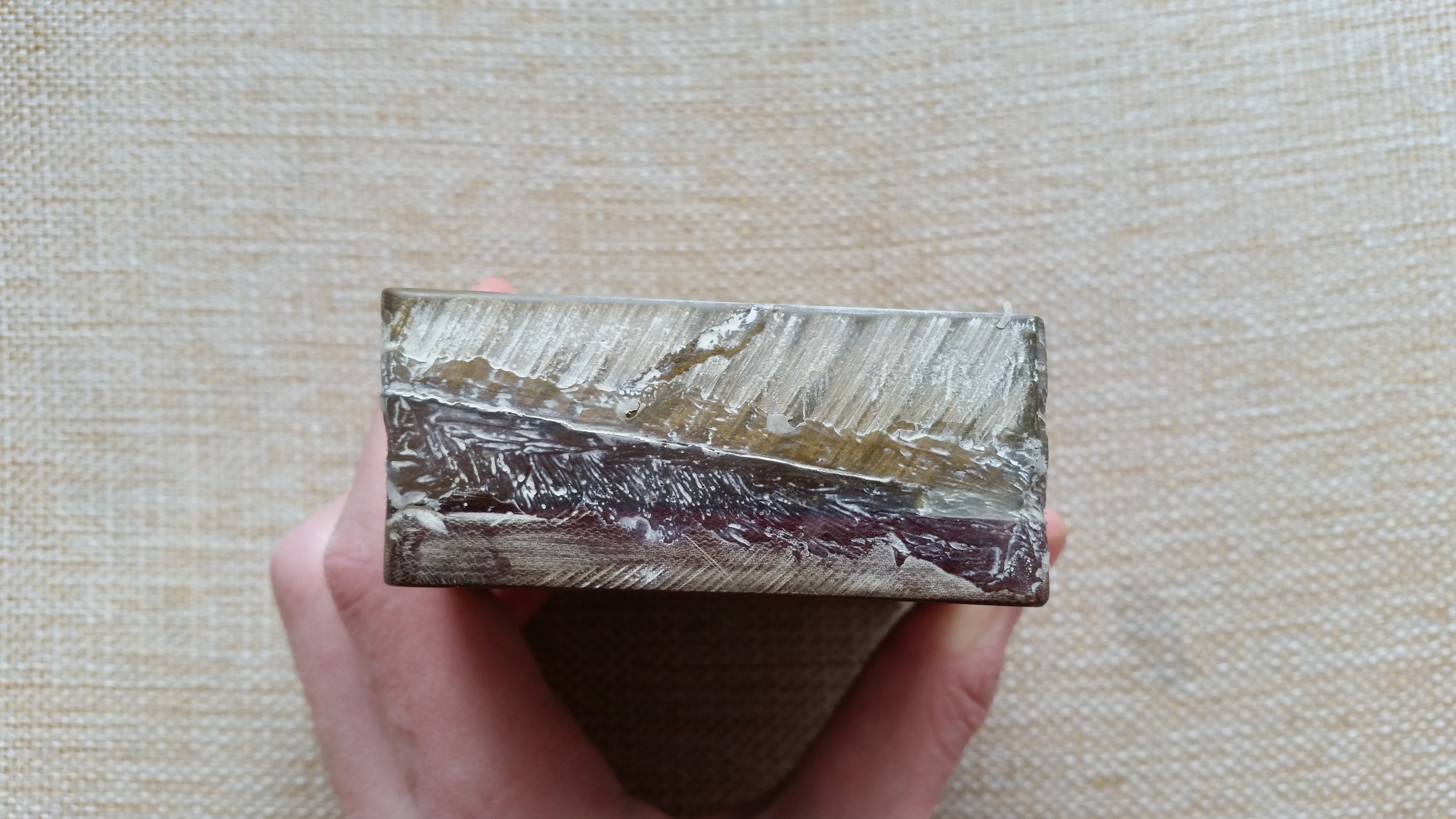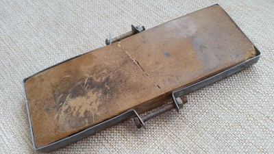 Синтетический японский водник King, зернистость 4000 по JIS, старого производства (сейчас именно такие не делают). Куплен на аукционе в Японии. Размеры 210х70х22 мм. Раскололся пополам от падения, сделал ему стяжку из оцинковки и подготовил поверхность. Трещина забьется суспензией и будет работать штатно. Есть скол одного угла и скол на одной грани, на фото видно. Связка бакелитовая, много воды не пьет, сохнет быстро. Использовал его с суспензией (ботан или синтетический слурик) после 1000 для затирания рисок, справляется за 6 - 7 минут и готовит кромку к тонким природникам или 8000 синтетику. Вообще, отличный камень, после его раскола, заменил его суитой, поэтому к нему так и не вернулся. Цена - руб.