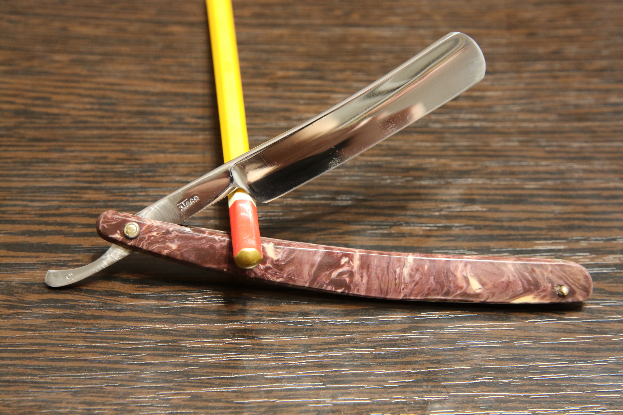 Опасная бритва ручной работы, не серийка, сделана в Японии в какой то общине, ширина полотна 20 мм, профиль полуклин, ручка из перламутрового пластика, все родное. Сталь Ясуки, их традиционная твердая углеродка. Подготовлена мной к бритью (сносит любую щетину как бульдозер за счет веса и профиля). Цена - руб.