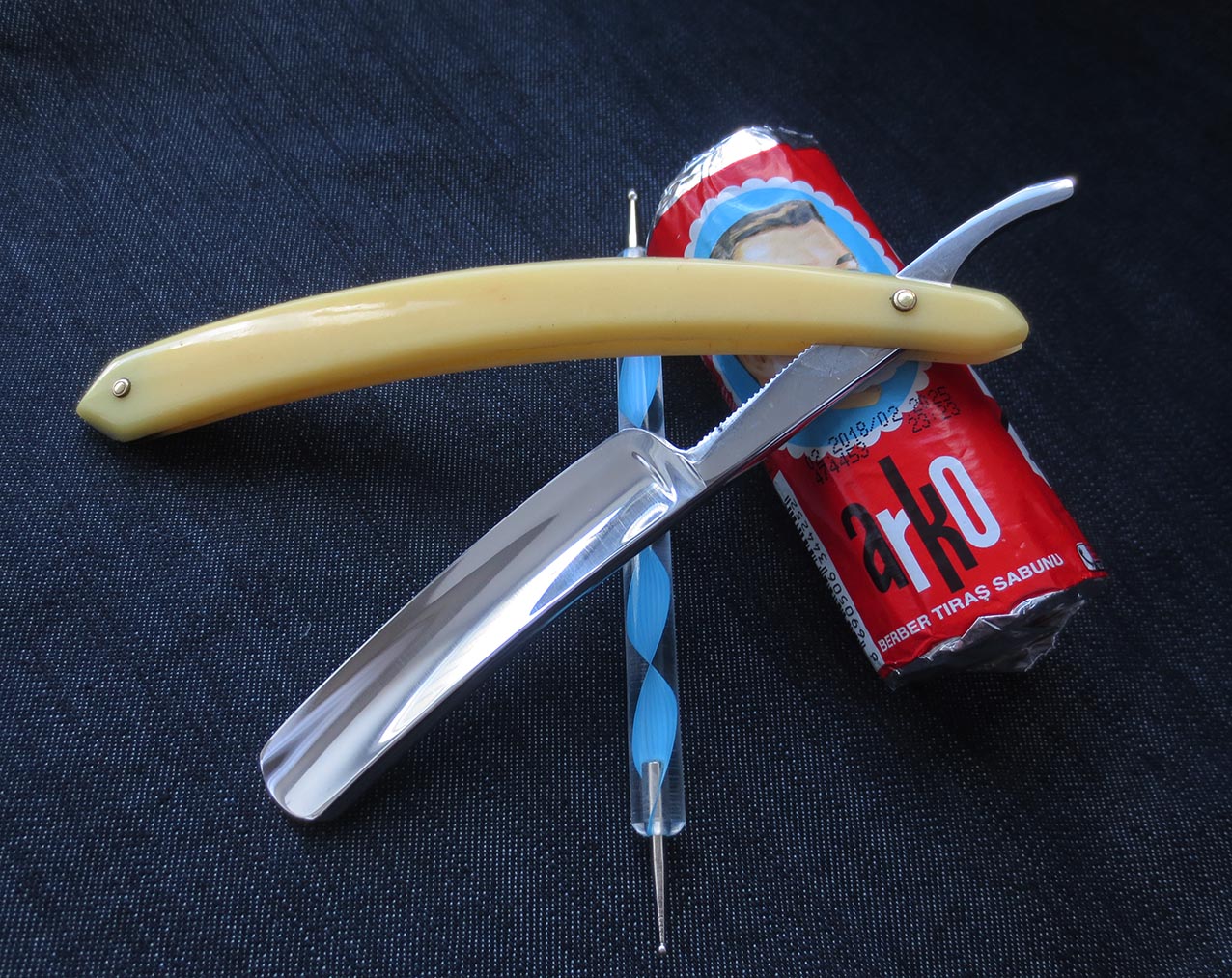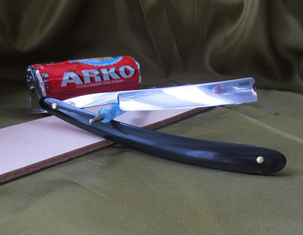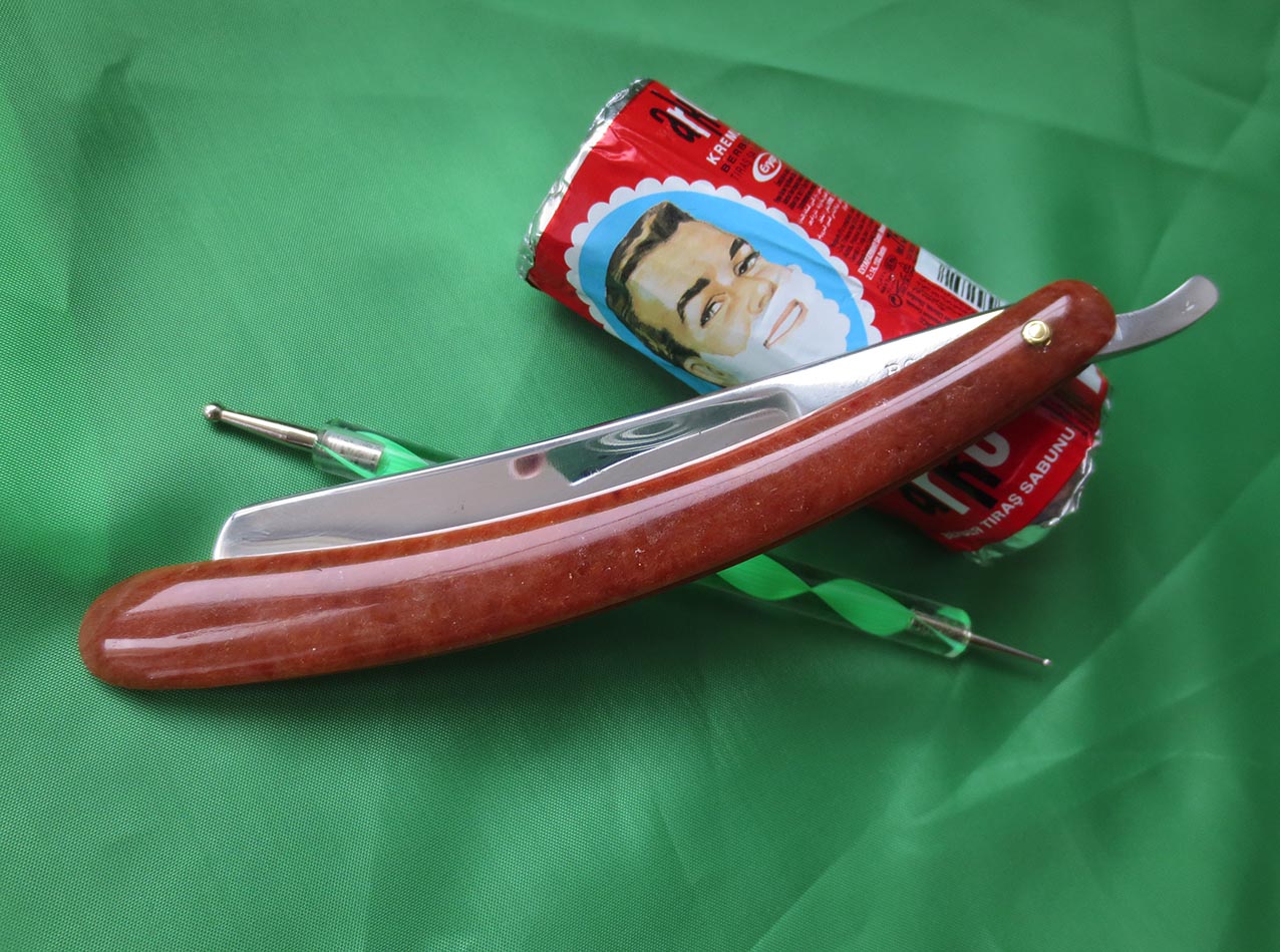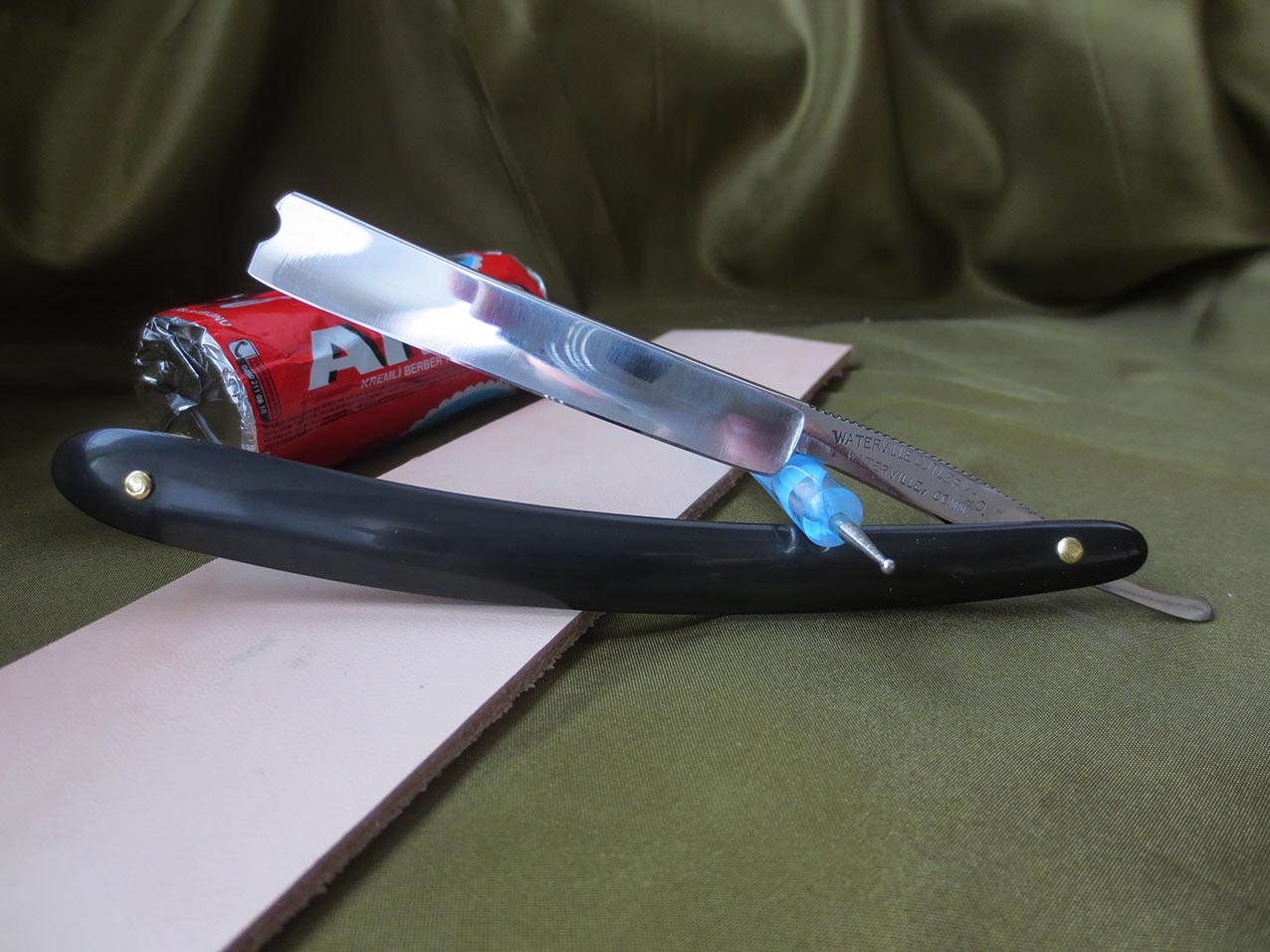 1) Опасная бритва Waterville Cutlery Company. Углеродистая сталь, ширина полотна - 4/8 дюйма, заводская оправа из эбонита, заклёпки - латунь. Приятная, верткая бритва для любого, от начинающего до профи, подойдёт не только для основного бритья, но и для обрамления усов и бороды... Заточена на японских водных камнях, протестирована, побрился отлично. После проверки продезинфицирована спецсредством "Миросептик" на этиловой основе, направлена и в работе до покупки не будет. 2) Также к бритве приложу заготовку из натуральной кожи растительного дубления для самостоятельного изготовления колодочного ремня для правки, размеры 280 х 50 мм. Данный набор достаточно недорогой, но в то же время весьма достойный вариант для новичка и не только, попробовать себя в этом настоящем мужском занятии, понять ваше это или нет,не вкладывая больших средств. Начинающим подскажу и покажу, как пользоваться и ухаживать за инструментом, также подскажу по изготовлению ремня для правки. Цена набора - 2600 рублей.