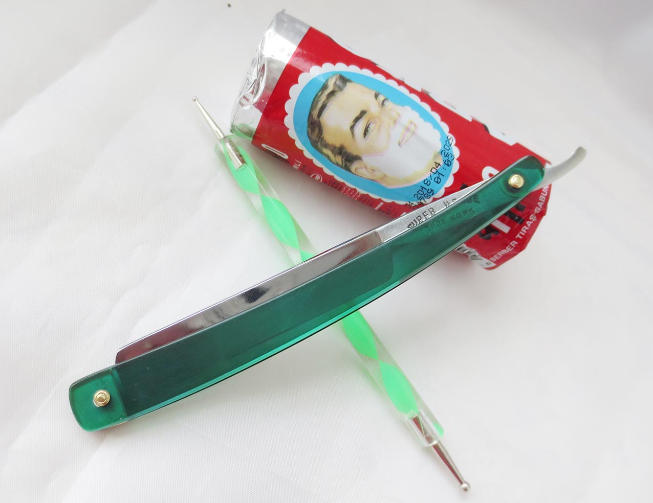 Опасная бритва SUPER WEDGE (супер клин) Shop Work G.D.Abrams & Son Wayland.N.Y. Углеродистая сталь, ширина лезвия - 13,5 мм, родная оправа из прозрачного зелёного пластика, заклёпки - латунь. Бритва в отличном состоянии, заточена на японских водных камнях и полностью подготовлена к работе. После заточки была продезинфицирована, направлена на чистом кожаном ремне и в использовании до её покупки гарантированно не будет. Чистая, очень вёрткая бритва, особенно рекомендовал бы её, из-за небольших размеров, не только для основного бритья, но и для ухода за усами и бородой. Также всегда в наличии ремни для правки и при покупке с ремнём почта по РФ за мой счёт. Цена - 3250 рублей.
