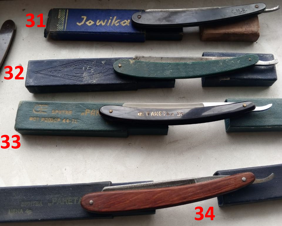 Так как последние 3 года я вообще не следил за ценами на рынке, прошу корректировать ценники, если я некорректен в ценообразовании. Фото делал родственник, далёкий от темы бритья клинковой бритвой. Поэтому всем бритвам присвоил номера и краткое описание из того, что помню сам. При наличии интереса к покупке - попрошу человека открыть бритву и сделать подробные фото со всех сторон.
