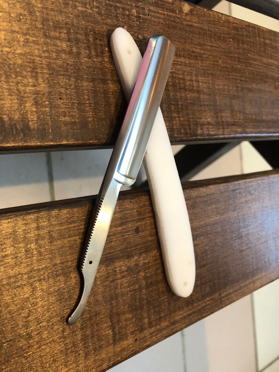ИЛИ частично восстановленную мной бритву (черная ручка). Требует заточки.