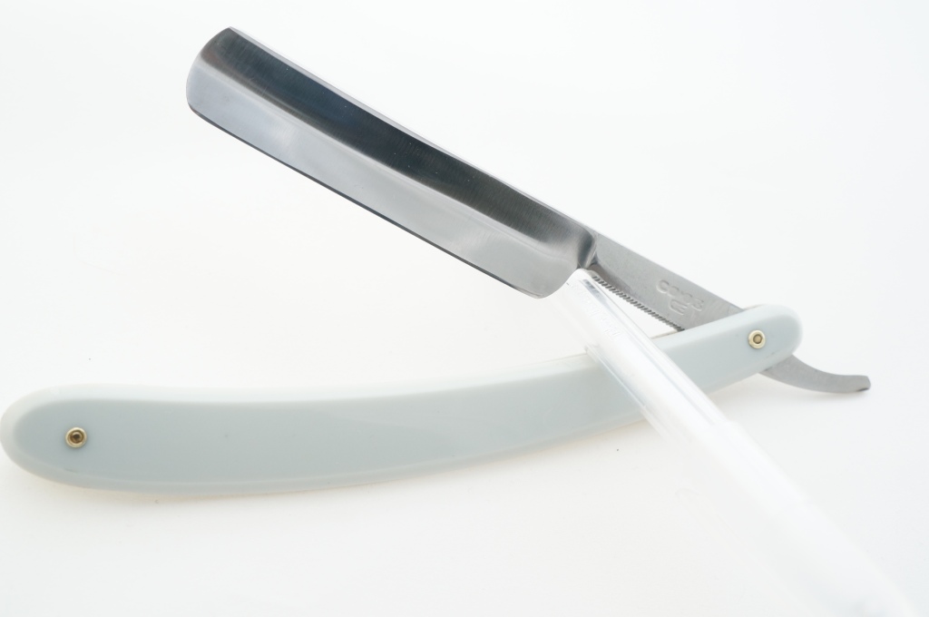 Состояние бритвы отличное, сделана легкая чистка, поставлены осевые шайбы, в целом можно сказать новая бритва лежала 100 с лишним лет, думаю конец 19 века. Ручка, по-видимому, прессованная кожа, клинышек олово, геометрия на высоком уровне, точится "с чувством". Размер чуть больше чем 20/5,5мм (полотно/спинка)