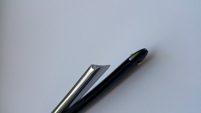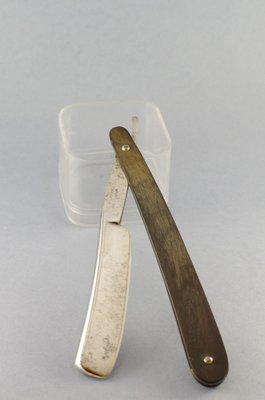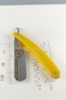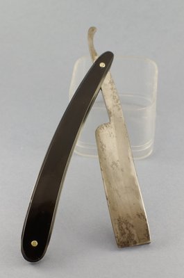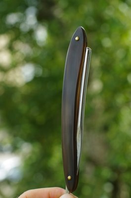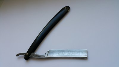 Бритва полностью в рабочем состоянии. Ручка целая, ровная, клинок паркуется по центру, без закусываний. На осевом пине сидит достаточно плотно, под собственным весом не вываливается. Парковка сделана утыканием носика бритвы в клинышек ручки. Насечка с двух сторон эрля. Длина рабочей кромки 8 см. Длина ручки 15 см, длина клинка 14,5. Обух 5+ мм. Увесистая бритва, 54 грамма.