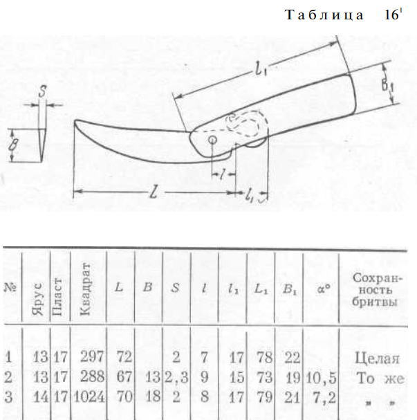 В бритвах этой конструкции обращает на себя внимание острота лезвия. Клинообразное в сечении лезвие имело угол резания а° в пределах 5-6°, а на бритве 12-14-453 он достигал 3,7°. Очень рациональна была и технология изготовления этих бритв. Технологически изучены бритвы 10-11-974 и 11-13-1044. На боковой поверхности лезвия был сделан макрошлиф с травлением на макроструктуру. На этих экземплярах широкое и тонкое лезвие было изготовлено из железа, а на режущую кромку клинка наварили стальную полосу. Ширина стальной полосы на обоих лезвиях равнялась 7мм. Обе стальные полосы термически обработаны. Характеризуя качество бритв, следует отметить, что бритва 11-13-1044, отточенная после изготовления на ней макрошлифа, чисто и легко брала на руке сухой волос. Таким лезвием свободно можно бриться и в настоящее время.
