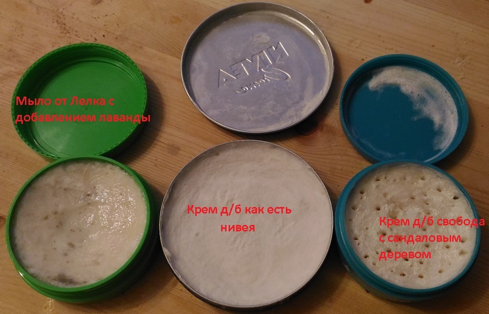 Закончил эксперимент, результатом доволен. С лева направо. Утрамбовал мыло от Лелика в компактную коробочку (от крема), удобно, но не хватало запаха. Вытащил, натер, добавил лаванды, перемешал, утрамбовал, закрыл и дал полежать. Крем нивея (синий), не понравился запах, в отличии от белого, появилась коробочка и он стал жертвой эксперимента, удачного. Крем свобода, добавлено масло сандала, неторопливо подсушено на батарее. С мылом все понятно, оно и так было отличным, а вот по кремам 1. крема д/б не потеряли свойств 2. экономичнее 3. удобнее 4. и наверное самое главное, любая отдушка (эфирное масло) с любой интенсивностью запаха (его количеством). 5. время, надо подождать пока подсохнет (примерно пара недель, не засекал, бросил на батарею и забыл) 6. отжать у жены баночки Вывод: любое нравящееся мыло без отдушки (детское, нвея беби, банное и т.п.) или крем без запаха (типа свободы) превращается в бритвенное мыло с любимым запахом в удобной для использования, хранения и транспортировки упаковке. Перестаньте тереть, не успеваю выделять смазку !!!