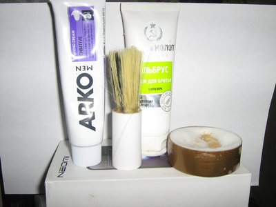 Re: Мыло и крем - у кого сколько и какие?А я пользуюсь и мылом и кремом. Мыло сварил для пробы шайбу одну, с глицерином и касторовым маслом. Крема, да какие есть в ближайшем магазине,такие и беру. Так! Папрашу нержать! это не помазок, это щётка из кабаньей шерсти для взбивания пены