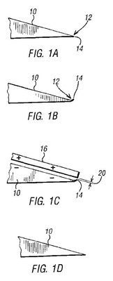 Re: электрохимическая заточкаДля растворения - на анод. -- Ниже - рисунок из Pat. US 6,488,834 (По сути - вариация на тему электроэрозионного метода.) Ключевой момент - очень малое расстояние между катодом и обрабатываемой поверхностью (анодом). "..., positioning a blade adjacent to cathodic plate such that the gap between the cathodic plate and a blade is very small relative to the size of the blade; ..." В данном случае быстрее стравливаются участки более близкие к катоду. Т.е. достигается выравнивание расстояния между электродами. При этом требуется также и параллельность режущей кромки и края электрода. -- В другом патенте (US 4,710,279 ) пишут, что скорость растворения выше на режущей кромке, в результате чего получается её скругление. "Maintaining of the initially established cutting edge within certain types of tools is important in order to achieve maximum cutting efficiency during usage. Frequently, during manual or mechanical resharpening, the initially established geometry of the cutting edge is altered. Within the present invention, the initially established geometry is maintained." Правда, дальше там утверждают, что подбор состава электролита и напряжения между электродами позволяет выровнять скорости травления... Но ведь и в этом случае радиус скругления кромки будет не меньше, чем будет стравлено с плоскостей? Цинизм - это способ спокойно принимать жизнь такой, какая она есть.