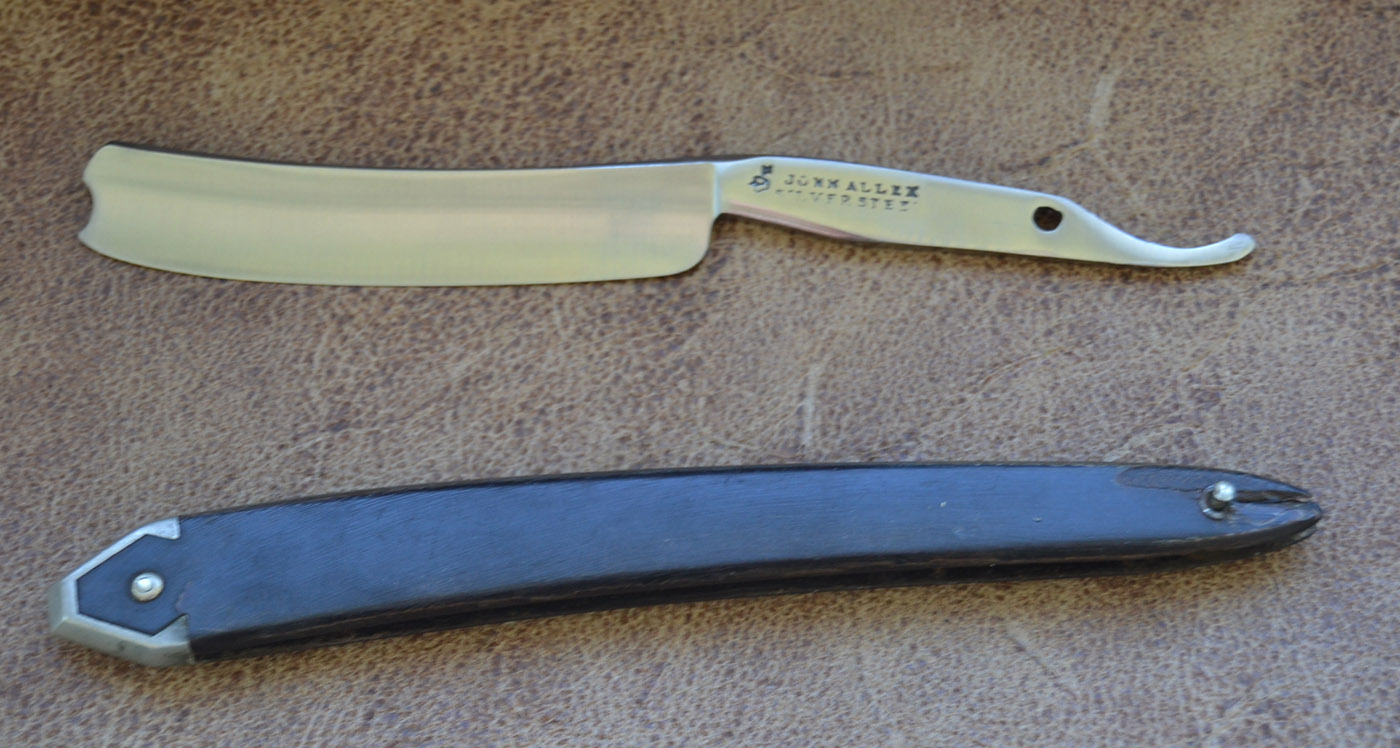 Мне тоже вначале так показалось. Подумал, что какой то таинственный прошлый владелец подточил рок и филигранно подогнал оковку, дабы починить бритву, после того как она получила трещину по нижнему пину. Но после разборки понял что ошибся. Скорее всего бритва имела этот набалдашник с самого рождения. Обратите внимание на производителя, бьюсь об заклад, многие видят его впервые, как и я. Всем известен Джозеф Аллен и его сыновья, Джона Аллена я не встречал до селе. Так же и не встречал такой любопытной рукояти. Итак, как это было сделано. Из какого то тонкого листового металла, так и не понял что это за металл, была изготовлена оковка. В нее вставлены половинки рукояти и тут самое интересное, я думаю, что в щель между рукоятями был залит расплав, об этом кстати свидетельствуют пустоты внутри клинышка. Жаль не сфотографировал оковку изнутри, там они явно видны в клинышке, образовавшиеся из за пузырьков воздуха. Да и рукоять удалось достать лишь частично, из за трещины пина. Иначе ни о какой разборке речи бы не шло. В общем еще одна забавная технология, так и не получившая распространения.