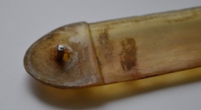 Re: Рекомендации к разборке - сборке ручки бритвы.Сегодня, при разборке старого клина из Шеффилда, натолкнулся на интересный момент. На месте заклепки, крепящей полотно бритвы, все как обычно. А вот в другой части ручки (где у более "молодых" бритв находится клинышек), было установлены: латунная заклепка, а рядом с ней стальной штырь, который прятался под декоративными шайбами. Под старыми почти 200-летними наслоениями его и не особо видно было.
