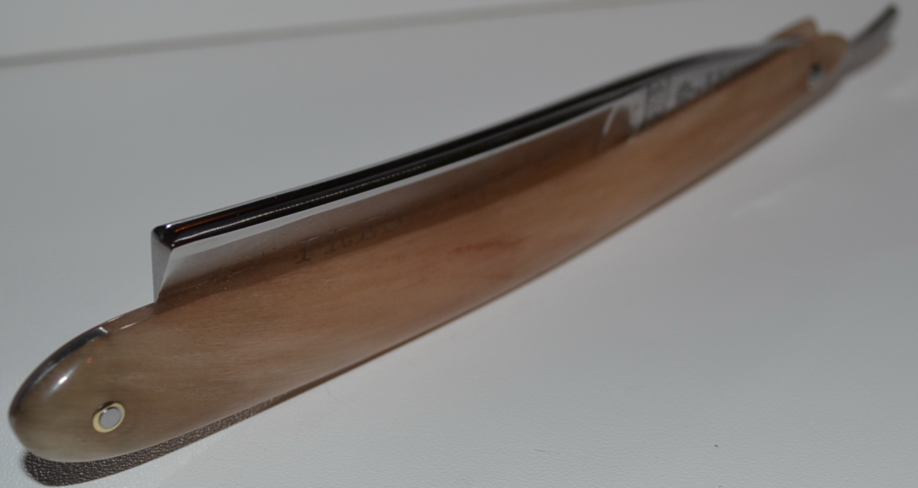 Цельный рог горного барана, тонирован, полирован.Клинышек как всегда, олово. Бритва H.Boker&Co №2666 Выпущена в годы правления Рузвельта.