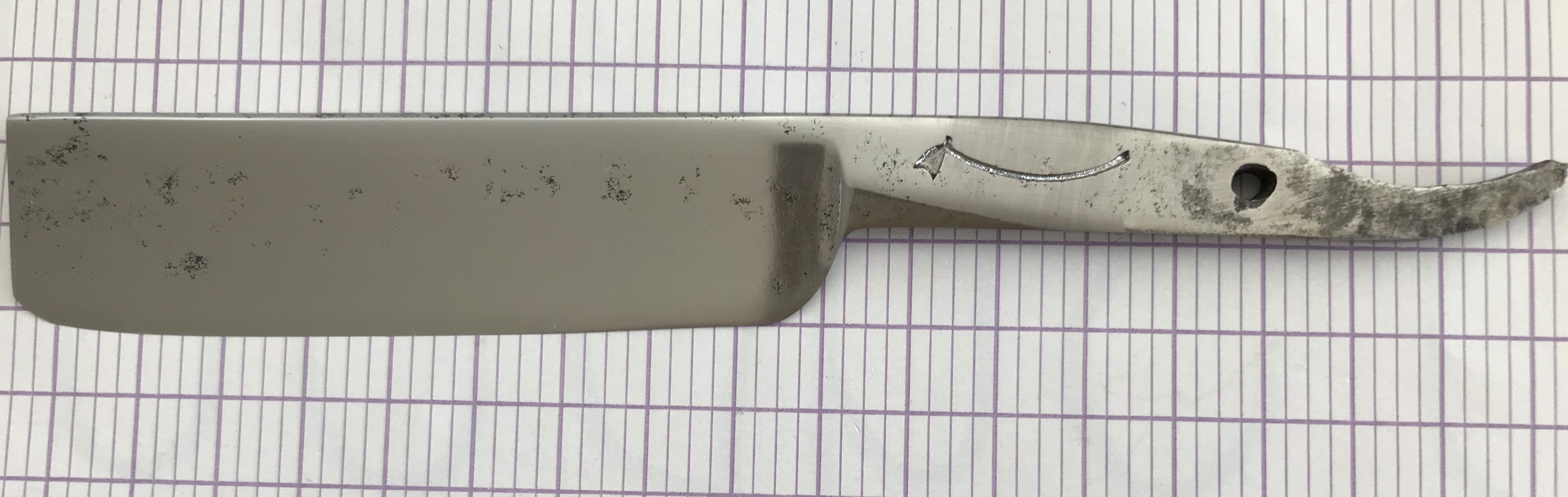 Начинающие реставраторы...У пятки было утолщение на 1,5 сантиметровом расстоянии и спереди тоже. Я даже не задумывался о пятке. Видимо до меня её толком и не точили. Честно говоря я даже не видел что залез на пятку. Вообще такое чудо первый раз вижу. Никогда этого не встречал раньше. И вот те на - именно на этой бритве!