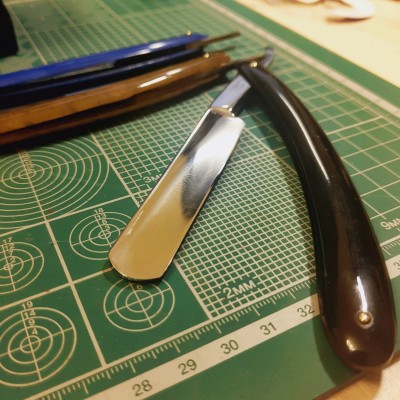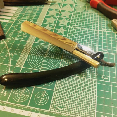 Начинающие реставраторы...Бритва была угроблена наждаком, фото "до" (с наждака), к сожалению нет, поверьте - это был ужас. Вначале работал на гриндере (первое фото), потом было "потом"