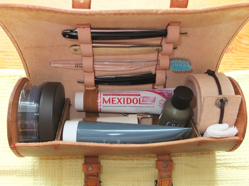 Итого поместилось 14 предметов: три бритвы ремень для правки баночка для взбивания пены мыло в мыльнице масло для бритья крем помазок ножницы зубная паста зубная щетка салфетки полотенце Re: Футляр для опасной бритвыСпасибо!