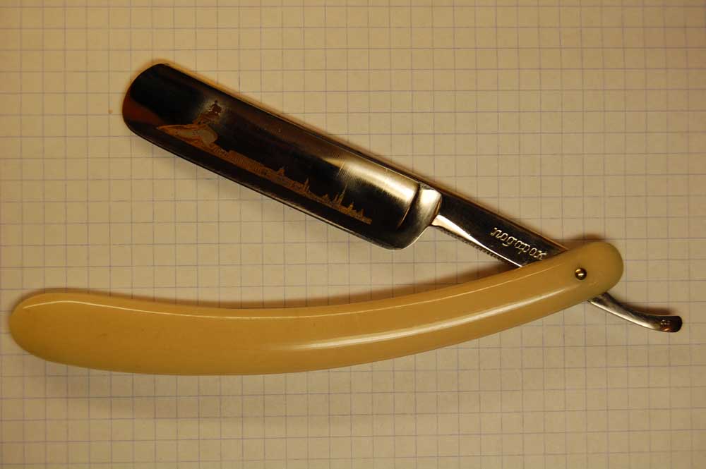 2. Подарок. 59 год. Очень мелкие царапины на лезвии, без сколов, глубокие каверны на середине лезвия( со стороны рисунка, ближе к обуху).Напыление на рисунке частично слезшее, на серидине обуха слезшее полностью. Родная коробка, край чуть надорван. 3. Станок. Нарушена развальцовка. Клейм нет, без коробки. Радиус изгиба около 3-4 см. Интересуюсь с целью продажи. Бритвы лежат без дела, заржавеют и просто выбросятся, а мне лишняя копеечка не помешает.