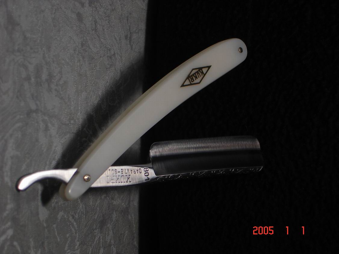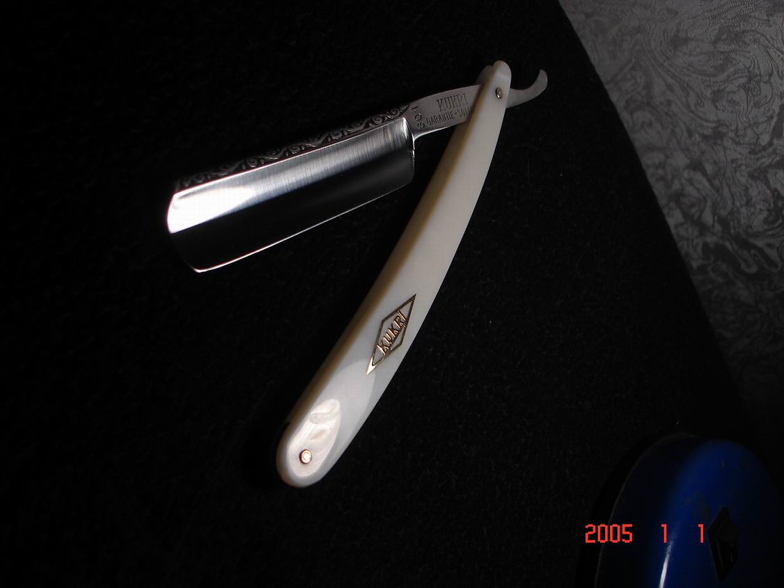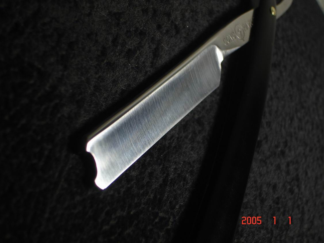 Скорее всего бритва в пользовании не была ,заводская шлифовка , бритва была разобрана , отполирована , ручка восстановлена , дополнил конструкцию шайбочками на осевом пине , что бы избежать трения ручки о полотно бритвы .