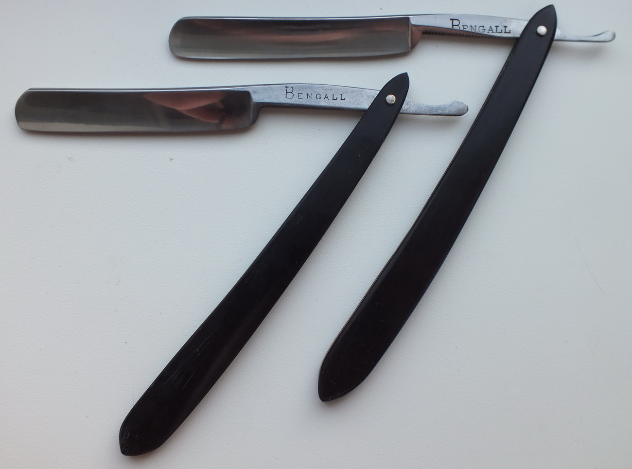 Состояние на фото. Оправа рог буйвола. Клинок 9/16, вогнутость 1/4, размер 136х12,5х4 мм. Бритвы заточены и готовы к бритью. Снято с продажи Bengall Show