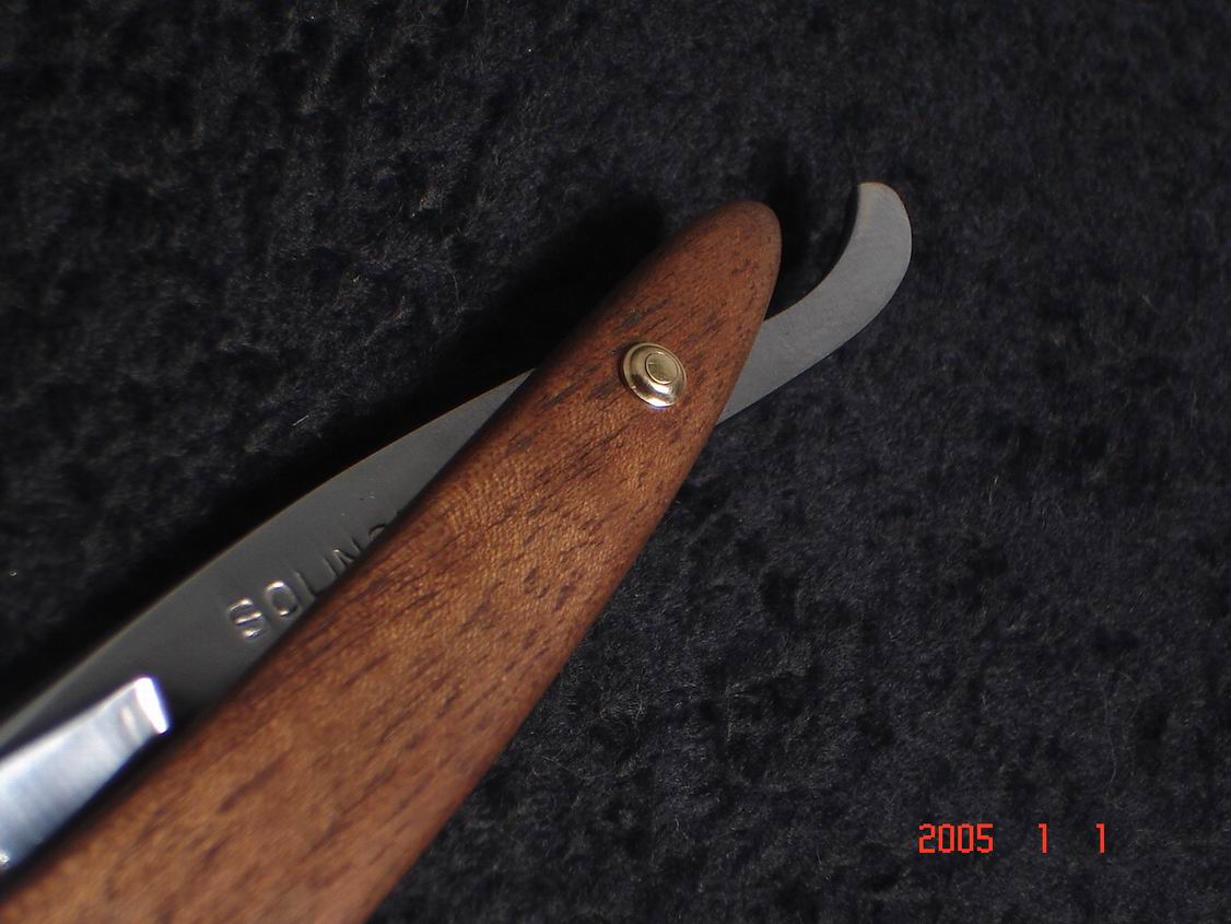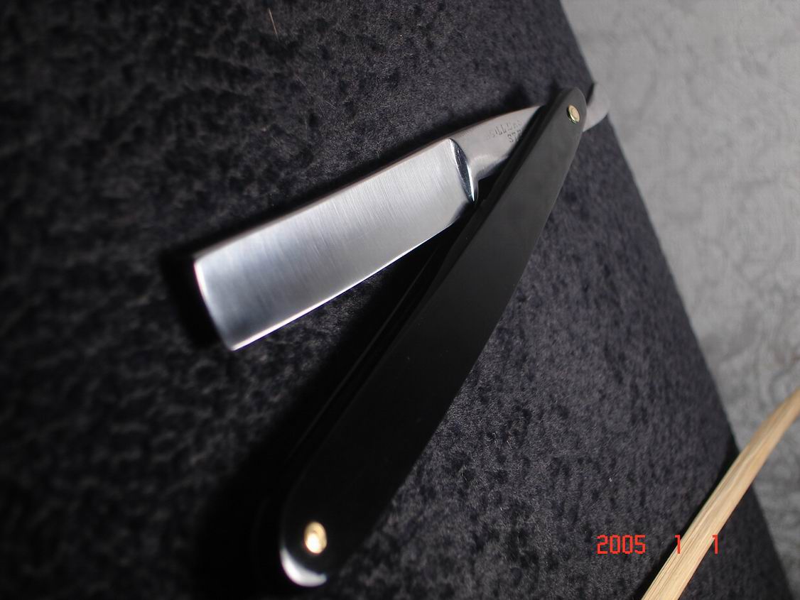 Скорее всего бритва в пользовании не была ,заводская шлифовка , бритва была разобрана , отполирована , ручка восстановлена , дополнил конструкцию шайбочками на осевом пине , что бы избежать трения ручки о полотно бритвы .