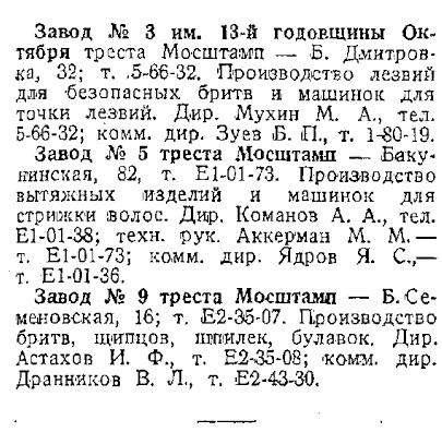 источник https://books.google.ru/books?id=avf_CA ... B0&f=false" onclick="window.open(this.href);return false; Вся Москва: адресно-справочная книга 1936 В 1935 году в газете «Ударник металлоизделий» (орган центрального комитета союза рабочих металлических изделий, г. Москва) была опубликована статья «Овладеть опытом лучших» , в которой сообщалось о приезде бригады рабочих завода «Труд» из Вачи на московский завод «Мосштамп №9» для исправления ситуации с производством бритв: «Уже с первого дня работы на «Моcштампе» мы были очень удивлены, что столичный завод так отстал по сравнению с нами. Поэтому нам пришлось заняться всеми вопросами, связанными с производством бритв высокого качества». Так, на том же оборудовании и при одинаковых материалах вачские рабочие «давали брака 0,3 проц., в то время, как у мосштамповцев брак до нашего приезда доходил до 40 процентов».