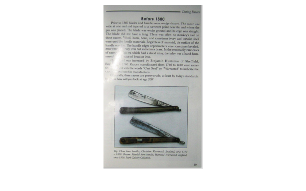 3. Чем тебе не угодила отсылка на данную книгу: 1770-1795 ("More Old Razors" by Lummus. Antiques, May 1927 p.372-374); ("Old Sheffield Razors" by Lummus. Antiques, December 1922 p.261-267))?