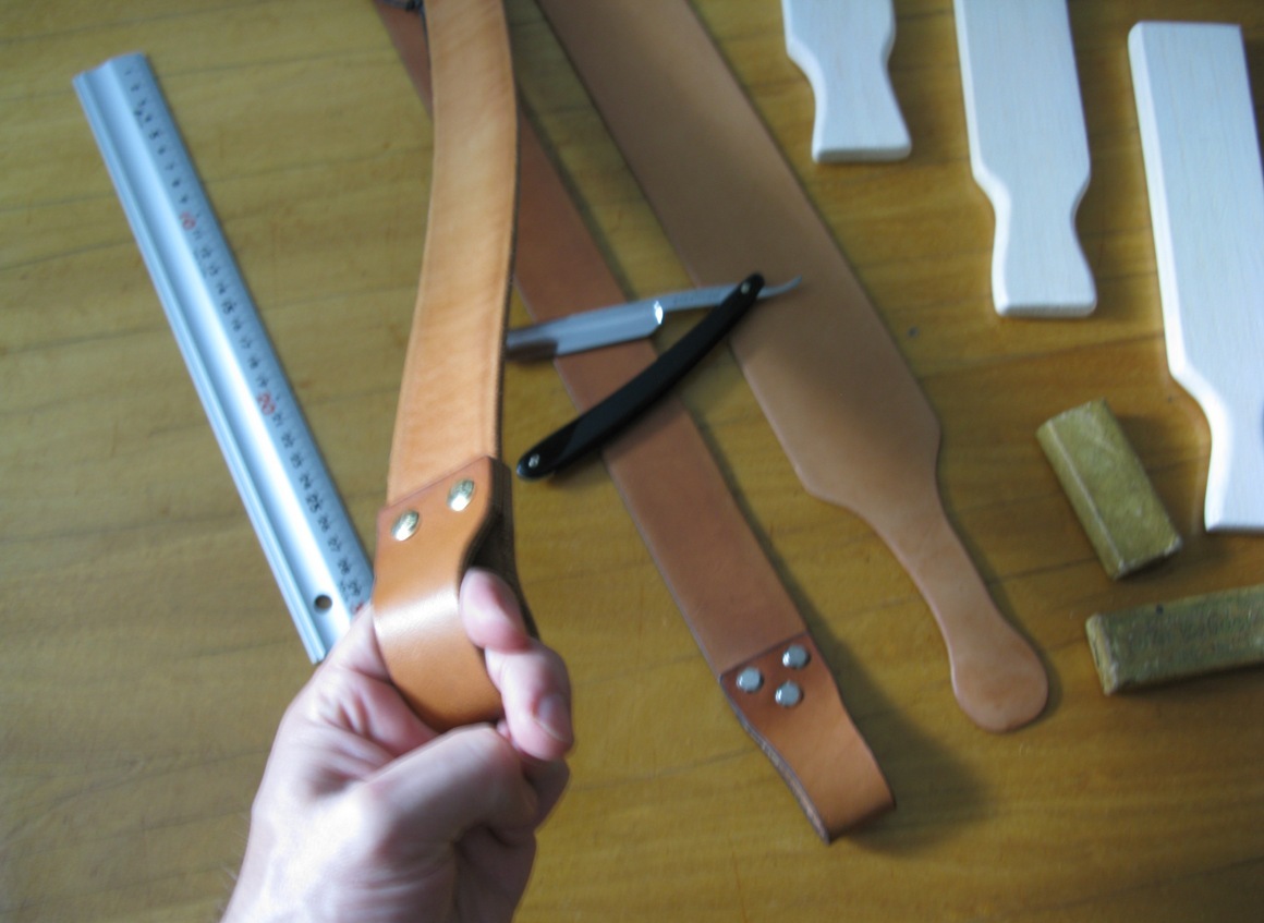 Делал себе узкий ремень из офигенного чепрака растительного дубления, а на остатки сделал 2 ремня с ручкой под палец  но можно держать за ручку всей ладонью. Форму держит хорошо. Всё чинно обработано. Правит интересно - тест на волос бритва проходит с необычным бархатным звуком, бритьё также нежнейшее.