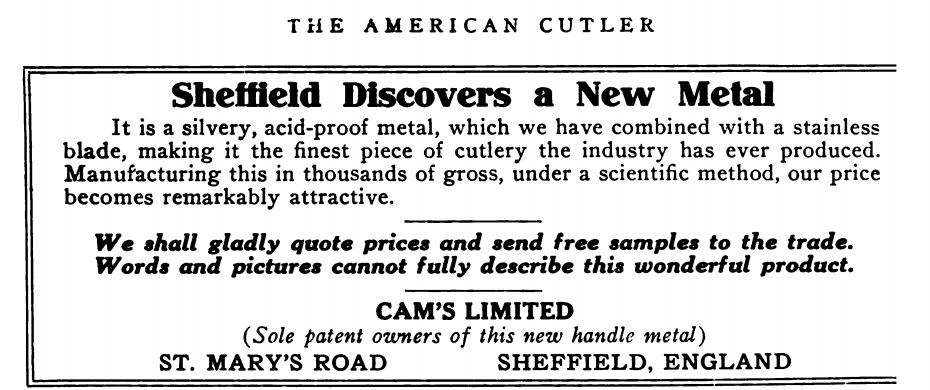 "В Шеффилде сделано открытие нового металла. это серебристый, кислотостойкий металл, который мы объединили с нержавейкой, что делает его лучшим для столовых приборов. когда-либо созданных. Производство - это тысячи брутто, по научному методу, поэтому наша цена становится заметно привлекательной. мы будем с удовольствием уменьшать цену и отправлять бесплатные образцы для торговли. слова и изображения не могут полностью описать этот замечательный продукт." Если это и есть silver steel, то год ее появления 1922 и стало быть датировка некоторых бритв упрощается. или я ошибаюсь по поводу silver? Re: Тип стали клинка бритвы.Ошибаетесь это не о стали , чего то типа мельхиора и т.д. , делать ложки из стали с углеродрм в районе 1% ( плюс - минус , понятно ) , а меньше бритва не выйдет - глупость абсолютная . Касрюльная нержавейка не калится - нечему там , 0.3 % углерода и то максимум , так что металл , но не сталь .