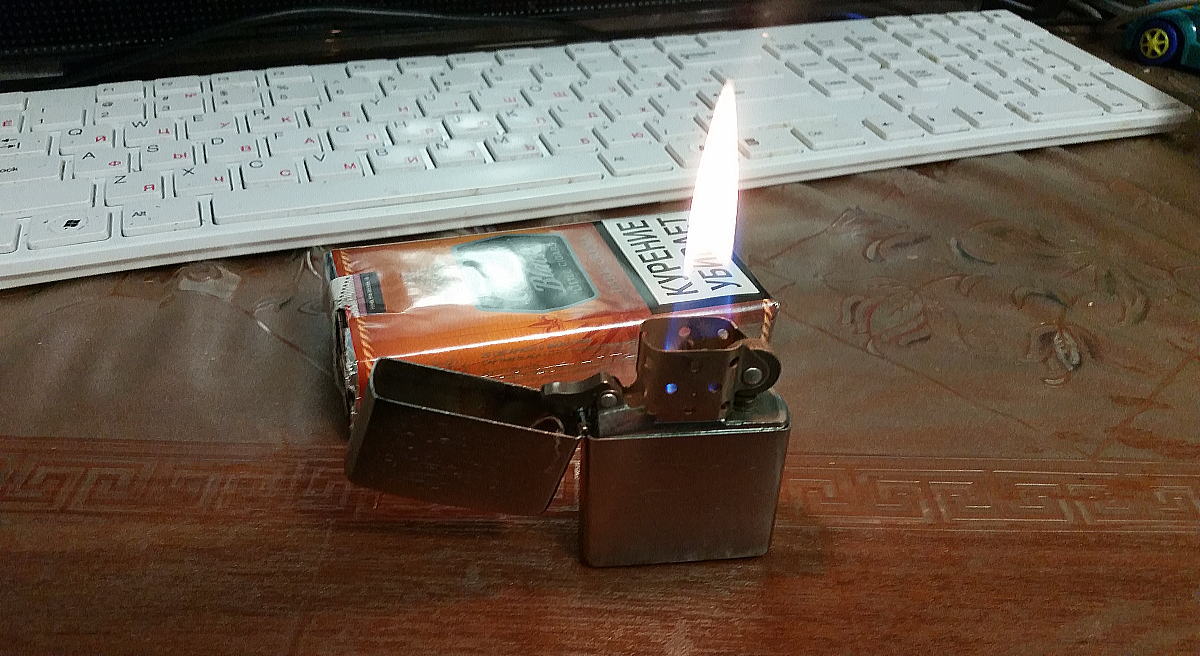 Самая простая, какая только бывает. И, как понял, тут как и в бритвах - цена только от оформления зависит. Бензин, фитиль, кремень и начинка у всех одинаковая. За 300 рублей, в октябре брал ещё. Бензина зипповского к ней две баклажки по 600 рублей (355 мл). Пока на сегодня истратил только около 200 мл. Скажу я вам, очень мне всё нравится. Особенно на ветру. Проще пальцы пожечь, чем затушить пламя. Вот скоро завяжу с курением, так ничего, зажигалка пойдёт в дачное хозяйство. Вот она, моя красотка: Ремонт опасных бритв, звонить с 11-00 до 23-00, +79267729357, (viber, whats app, telegram, VK), спросить Олега.