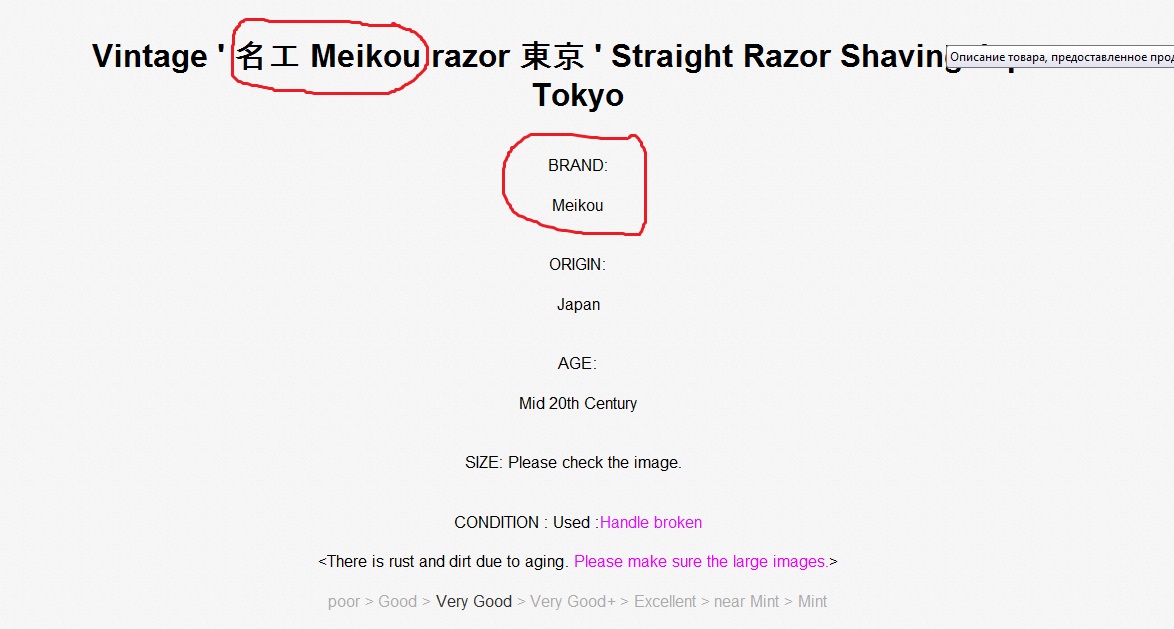 Бритва, по всей видимости не пользованная, только пришлось немного почистить эрль, поэтому не все иероглифы хорошо видны.