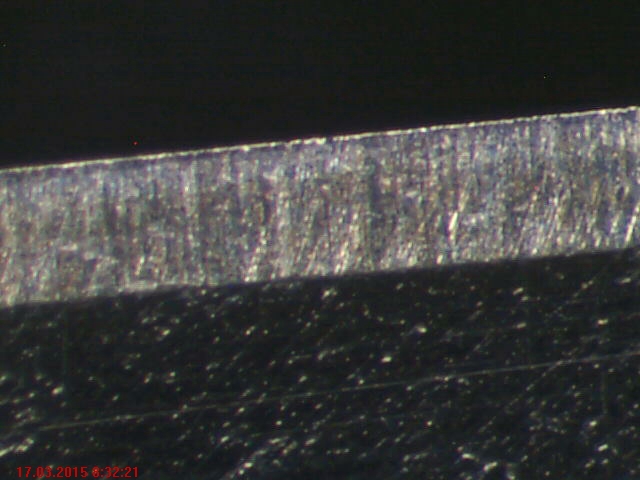 я пардон конечно за микроскопию, снимать на китайский телефон в китайский микроскоп, китайскую бритву, заточенную на китайских камнях.... Ой, риса захоте... 媽媽,我想米!!! В общем где кромка как напильник - это тысячник, где мельче - поработал после тысячника китайцем, ну минуты 3-4 от силы. Ни там ни там особо не старался, движения туда-обратно, не переворачивая, просто для примера. Как видите, риска довольно однородная.