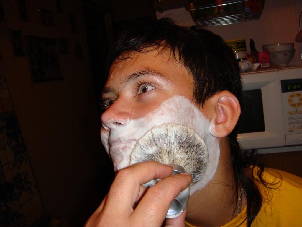 Текущее время: 14.02.26, 3:36 Respect to Tras Krom. Использование WESTER BROS.Модераторы: Олег Бритва, Модераторы Respect to Tras Krom. Использование WESTER BROS.Привезли сегодня Wester Bros... Внешний осмотр бритвы в целом - 4+, лезвие - твердая 5. Ручка с небольшим дефектом, смещение по оси щёчек ручки (но и наплевать на это, скорее всего пины и клепка не родные), потертости на внутренней стороне - тоже фигня. Заточка - отлично. С утра уже побрился, было мучительно думать о том, что сегодня бритву не опробую... По приходу домой выход был найден - у старшего (14 лет, пубертатно-прыщаво-пушковый период)по всему лицу пух, длиной до 4-6 мм, козлиная бородка. Нам с супругой надоел этот вид уже давненько. Сын ни разу не брился... По обоюдному согласию (даже уговаривать не пришлось, сына, я имею ввиду) сын был немного распарен, намылен...и выбрит. Ощущения бреющего немногим отличаются от бреющегося, тот же кайф и выброс адреналина. Бреет отлично, тем более брился мягкий пух, а не торчащая щетина....Короче, фото ниже. Единственное, упустил, догадался фоткать только после намыливания.... Качество, конечно, никакое...в одной руке бритва, в другой фотоаппарат... Естественно кадры сделаны не в момент бритья, а после провода бритвы...Уж извините...