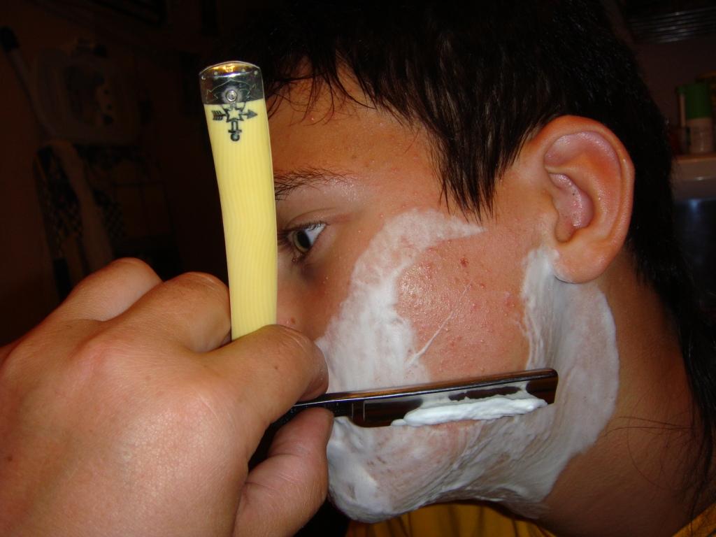 Текущее время: 15.04.26, 16:33 Respect to Tras Krom. Использование WESTER BROS.Модераторы: Олег Бритва, Модераторы Respect to Tras Krom. Использование WESTER BROS.Привезли сегодня Wester Bros... Внешний осмотр бритвы в целом - 4+, лезвие - твердая 5. Ручка с небольшим дефектом, смещение по оси щёчек ручки (но и наплевать на это, скорее всего пины и клепка не родные), потертости на внутренней стороне - тоже фигня. Заточка - отлично. С утра уже побрился, было мучительно думать о том, что сегодня бритву не опробую... По приходу домой выход был найден - у старшего (14 лет, пубертатно-прыщаво-пушковый период)по всему лицу пух, длиной до 4-6 мм, козлиная бородка. Нам с супругой надоел этот вид уже давненько. Сын ни разу не брился... По обоюдному согласию (даже уговаривать не пришлось, сына, я имею ввиду) сын был немного распарен, намылен...и выбрит. Ощущения бреющего немногим отличаются от бреющегося, тот же кайф и выброс адреналина. Бреет отлично, тем более брился мягкий пух, а не торчащая щетина....Короче, фото ниже. Единственное, упустил, догадался фоткать только после намыливания.... Качество, конечно, никакое...в одной руке бритва, в другой фотоаппарат... Естественно кадры сделаны не в момент бритья, а после провода бритвы...Уж извините...