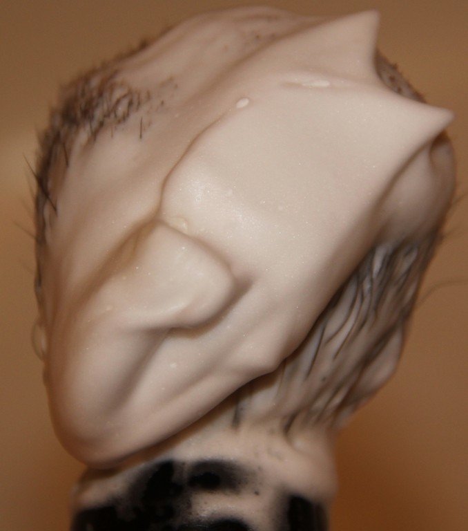 Вот это уже вполне подходит для бритья. Пена не высыхает на всем протяжении бритья. Наносится не толстым слоем, но вполне достаточным. Я развел не густо, а несколько жидковато, как сметана, иначе пена с бритвы плохо смывается. Бритье прошло очень даже хорошо, хотя скольжение было на минимально допустимом уровне - проведешь разок и кожа уже сухая. Причем хоть ногтем проведи, после чего кожа уже не скользит. Растяжку делать удобно, но лучше скольжения добавить. После разбавления мыла стеарином вдвое пережир снизился тоже вдвое. Брился Титаном, сам процесс прошел достаточно мягко, никакой жесткости или потяга не было. На кожу мыло со стеарином повлияло неплохо, не стягивает, в процессе бритья не щипает. Стеарин пахнет не особо приятно, надо добавлять ароматы. Но это уже не для тестов. В общем, это уже верное направление.
