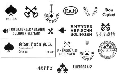 Торговые марки: F. Herder's Real German Hollow Ground (1898 No.34262), La Perla (1899 No.40110), F. Herder's Ready for Use (на ленте) (1903 No.58787), Friedr. Herder Abr. Sohn de echter Herder (1904 No.74797), Constant, Contador, Herder, F. Herder, F. Herder A. Sn, Friedrich Herder Abr. Sohn Solingen, F. Herderstahl Solingen, F. Herders Schopjesmesser (´Нож пикового туза´, датский язык), F. Herders Schopjesscharen, Pick-Ass, Pique-Ass, Schuppen-Ass (´Пиковый туз´), Fortuna, Meevaler, Don Carlos (1932), Spade.