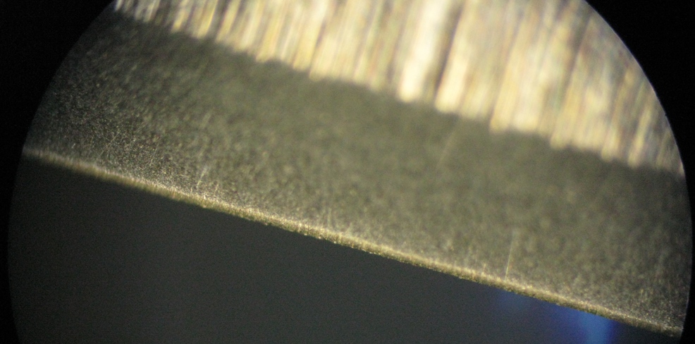 Re: Заточка с изолентойКультурно это когда "ться" Что касается изоленты, так ничего кроме более удобной правки и доводки она не даёт, и это удобство ИМХО не стоит, чтобы сносить обух. Только по желанию клиента. Вообще изолентой надо пользоваться умеючи. Вот как пример - человек решил самостоятельно восстановить остроту. На фото отчетливо видно, что возюкали на недостаточно мелком абразиве с изолентой (явно не один слой), так ещё не учли, что площадь контакта уменьшилась и любое давление критично - начал появляться заусенец. Переточу, сделаю ему легкий борд на мелком чистом крокусе/диалюксе и отпадет желание давить, да использовать некондиционные камни для периодического заострения.