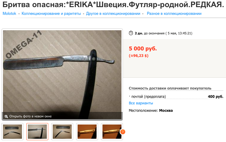 Вообще на молотке сплошные неадекваты. Каждый считает что его бритва самая старая и самая раритетная, а самое главное, ей брился сам Гитлер, или Сталин. Вот к примеру, 5000 рублей Но если жаба душит, за тысячу можно взять вот такой прекрасный ERN. Как раз подойдет подошвы резать. 1000р mind over matter