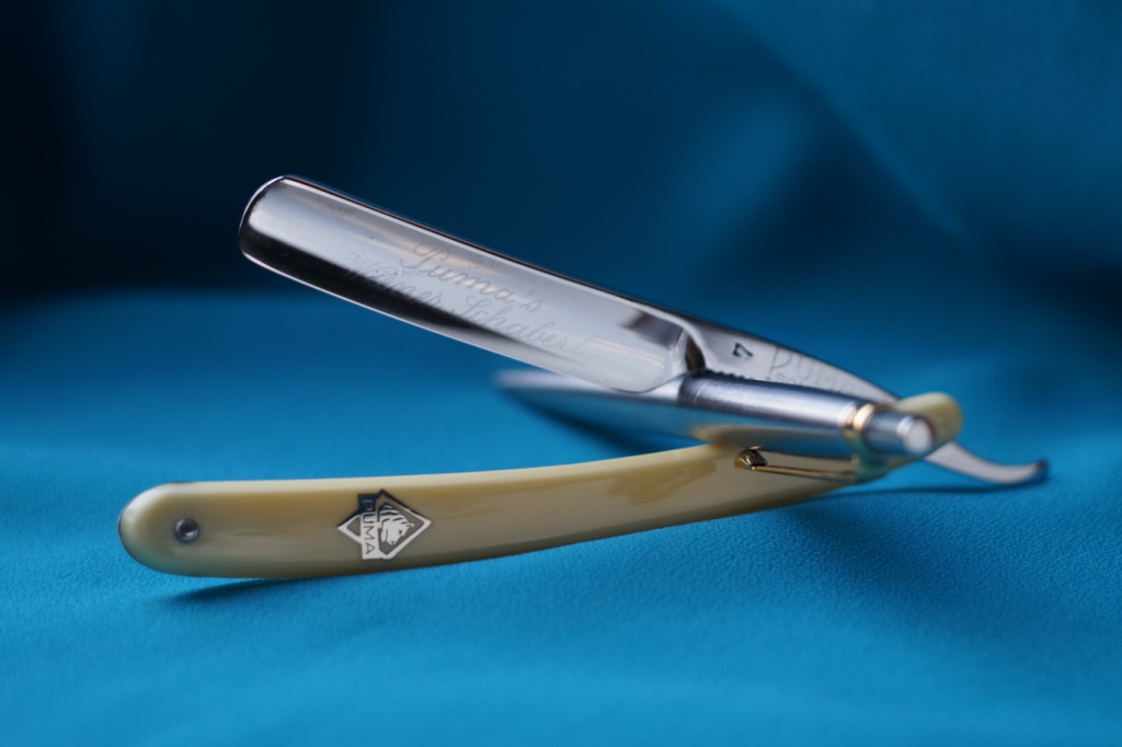 Made in Germany, from Best Puma Steel. Параметры: Размер 9/16 ( 14,3мм) Ручка -целлулоид Бритва без реставрации, легкая полировка и заточка. РК толщиной в ус Пумы. Все нюансы видны на фото, в жизни они не так заметны, но рука не поднялась их убирать, т.к. не увидел в этом необходимости и для её возраста это простительно. Сталь и геометрия бритвы выше всяческих похвал, шикарный рез. Продана киска Puma №7 Show