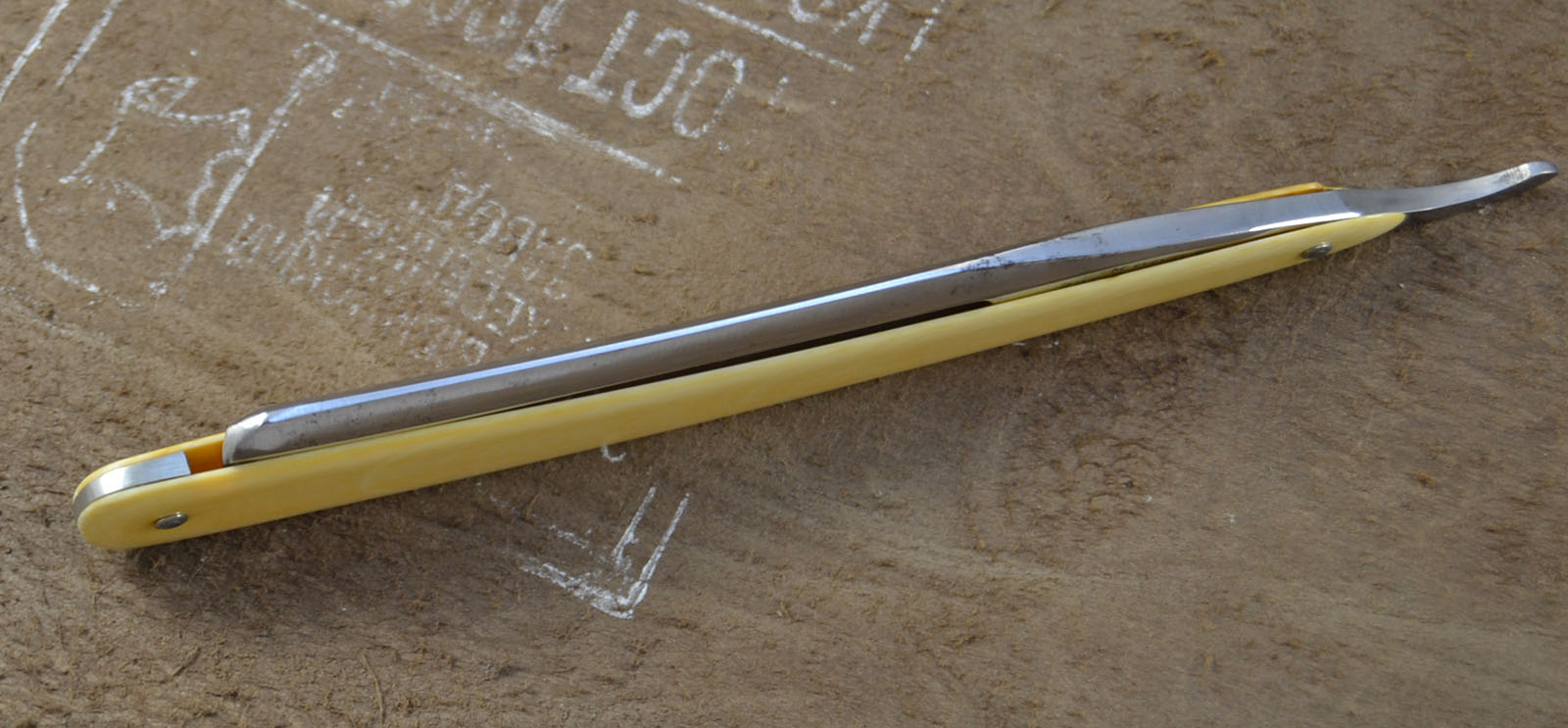 А бритва между тем очень классная, трехгранный обушок, массивный эрль, сталь показавшаяся несколько тверже, чам на большинстве старых шеффилдских клинов и геометрия очень понравились, опять же рукоять из слоника, хоть и потрепанная но вполне живая.