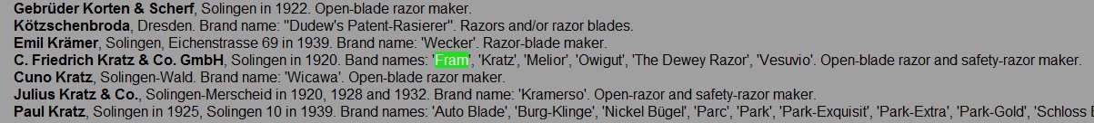 Re: Оцените FramОн много об этом пишет: FRAM (1899, no. 40613): Ernst Scharf, Frankfurt a.M. Registry FRAM: Ernst Scharff, Kober & Co FRAM: C Friedrich Kratz & Co Я не знаю, кто ещё ставил эту ТМ, но в данном случае это бритвы Julius Mandler & Sohn Solingen Wald На всех FRAM, что у меня есть, именно он, производитель, плюс реклама из газет 80-летней давности, доказывают это. Именно доказывает, а не просто написано. Так что в данном случае и спорить-то не о чем. Не забудь добавить, что это "твоё мнение". Эксперт, блин. На ссылочке, что ты выложил, - бритвы на 10 из 10, у меня есть такой набор. Ну и что? Фотки там отстойные. Да и мало ли где есть чего хорошего, Вот тут, например: http://www.britva.ru/forum/viewtopic.php?p=5424#p5424" onclick="window.open(this.href);return false; Человек просит свою оценить... Задай им там вопрос - какой производитель у бритв? Кстати, бритву я могу выпрямить и сделать дефект менее заметным. Ремонт опасных бритв, звонить с 11-00 до 23-00, +79267729357, (viber, whats app, telegram, VK), спросить Олега.