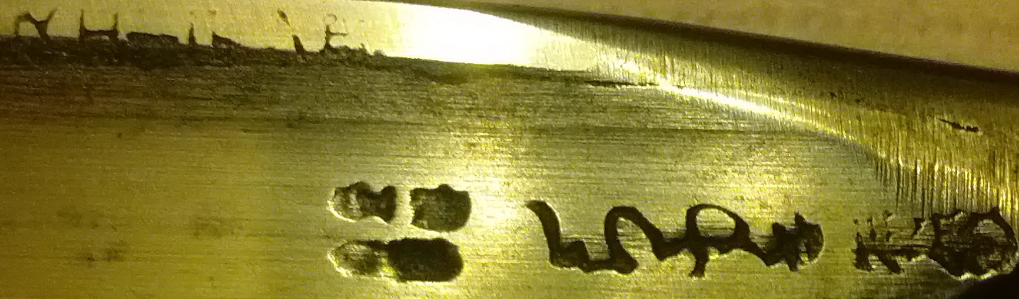 Третья : つらゆき- Tsurayuki Вторая: Клеймо сильно затёрто, сложно разобрать.. В середине пара иерогов 小林-Кобаяси. Скорее всего фамилия мастера. 小林-Кобаяси-распространённая фамилия. . Два иерога 小-Ко-"маленький", 林-Хаяси(Баяси)-"лес". В китайском языке эти иероги читаются как "Шаолинь". Запямотавал слегка .. "Шаолинь" немного не так пишется, 少林. Но тож похоже Челябинские мужики настолько суровы, что правят бритву не на ремне, а на роже.