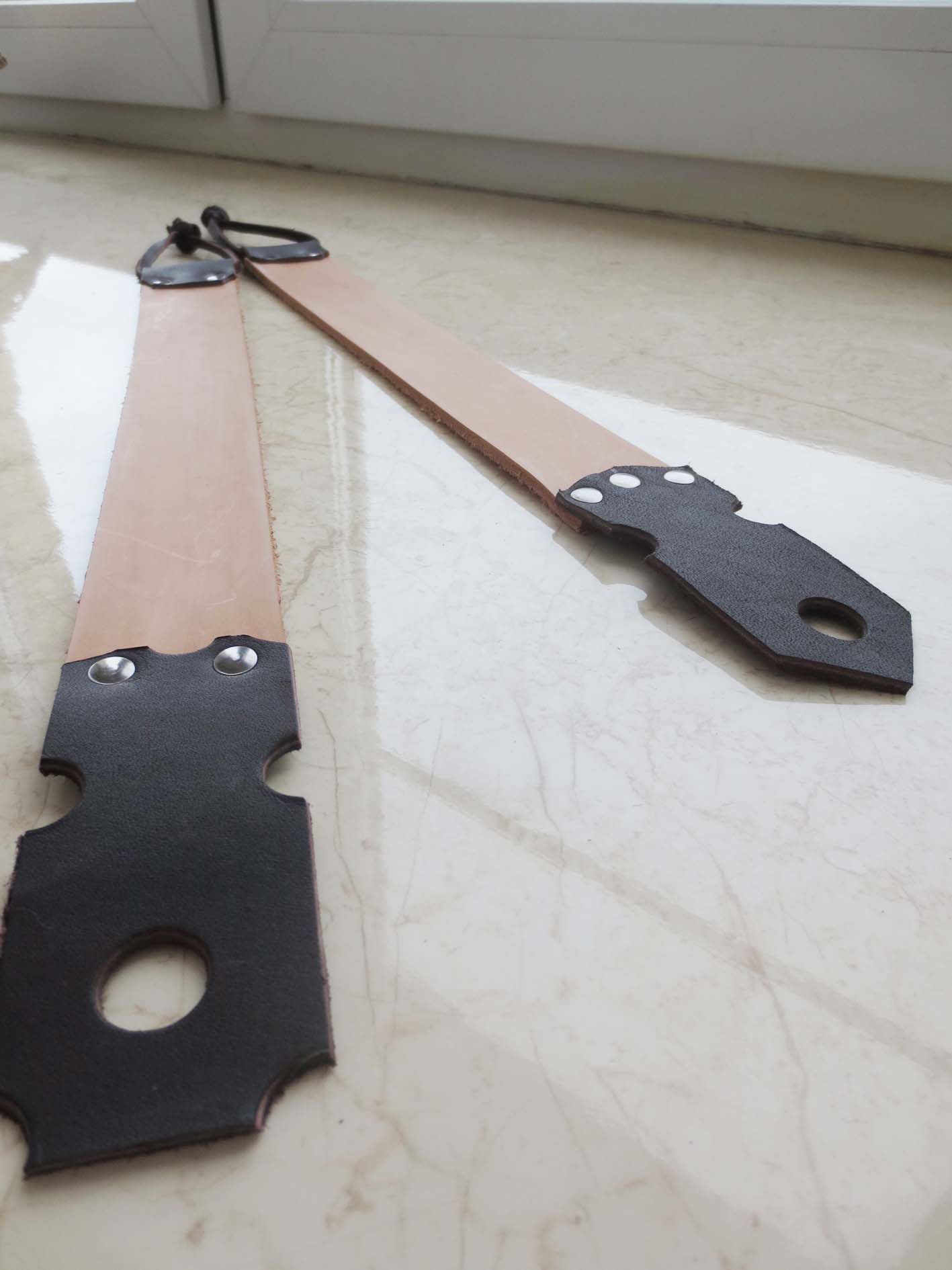 Re: Изготовление ремней для правкиЯ сам боялся момента перекручивания! Но, толстая твердая кожа вкупе с узкой полоской и тонким длинным шнурком показала себя весьма устойчивой конструкцией. Он будет крутиться, да, если пропустить одну веревочку в дырдочку. А если пропустить сразу обе-две - то нормально, не болтается.