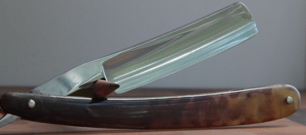 Никакой ржавчины. Сталь-углеродка. Ничего не разбиралось. Всё родное. По всей видимости, на ручке присутствует автограф прежнего владельца. Идеальная геометрия полотна-кромка тоненькая и равномерная по всей длине. Бритва заточена и готова к пользованию.
