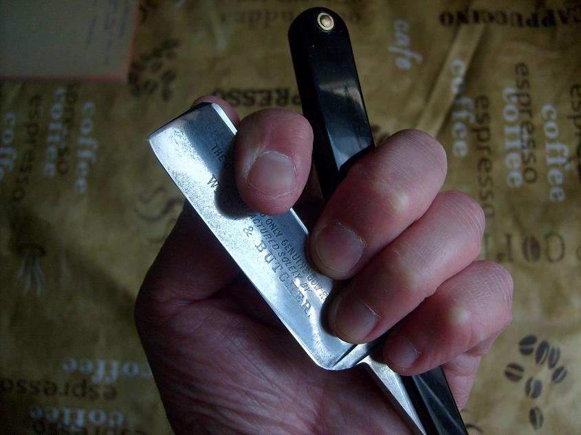 Одна тонкость, впрочем, есть. Мне пришло в голову это только сейчас. Это хваты для моих, относительно небольших пальцев, которые позволяют мне держать бритву так. Я допускаю, что люди с длинными, толстыми пальцами при одной попытке взять бритву таким образом, ОСНОВАТЕЛЬНО их порежут.