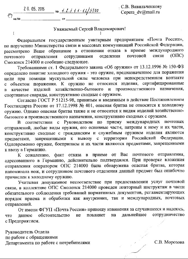 И на почте с пересылкой бритв ни когда проблемы не было. Насколько я знаю почта Украины намного оперативнее Российской. Возможно это связано с более компактной территорией и жесткой конкуренцией с частными компаниями аналогичного профиля. Но ситуация в Укрпочте сейчас не лучшая - сокращения, рост тарифов...