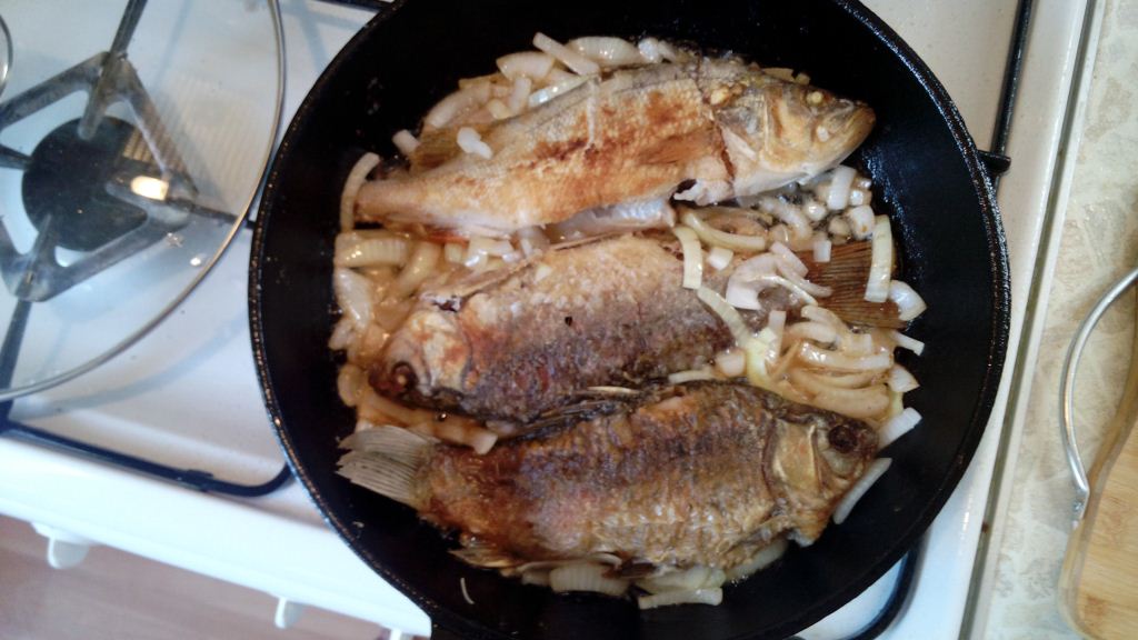 Re: Как и что мы едим и пьёмДобра всем, камрадэ. Совершенно случайно вырвался на рыбалку. За карасём отправились с сыном. Не прошло и получаса, как закинули крючки и тут...