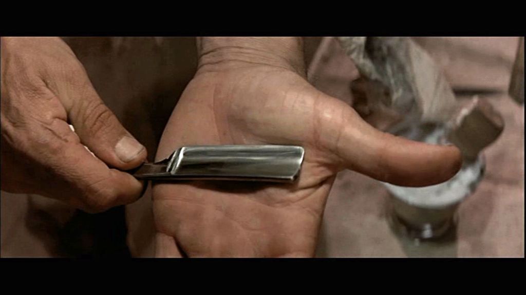 Есть кадр из фильма непрошенный 1992 с Клинтом Иствудом , когда перед отъездом на дело он бреется опасной бритвой .