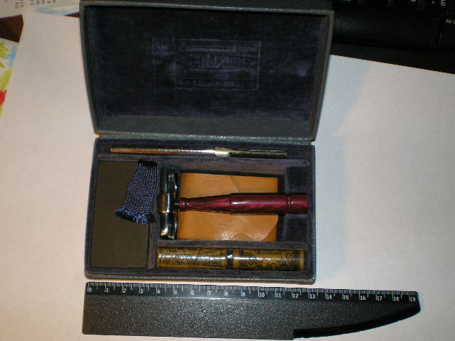 - футляр обтянутый серым ледерином, внутри выстлан синим бархатом. С ячейками под все вышеуказаные аксессуары.