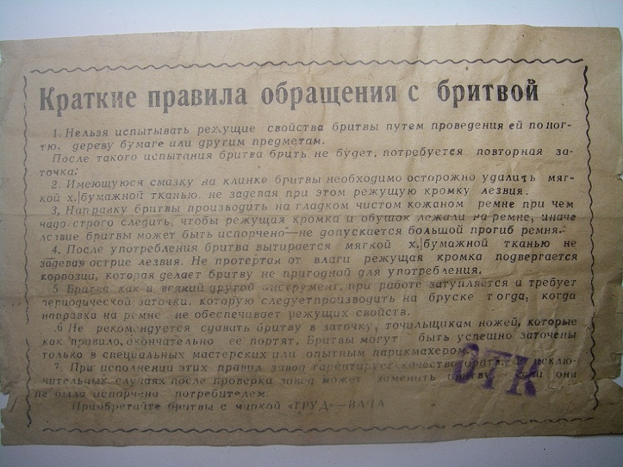 Дальнейшую историю завода "Труд" мы намеренно опускаем, так как производство опасных бритв после 1968 года было прекращено.